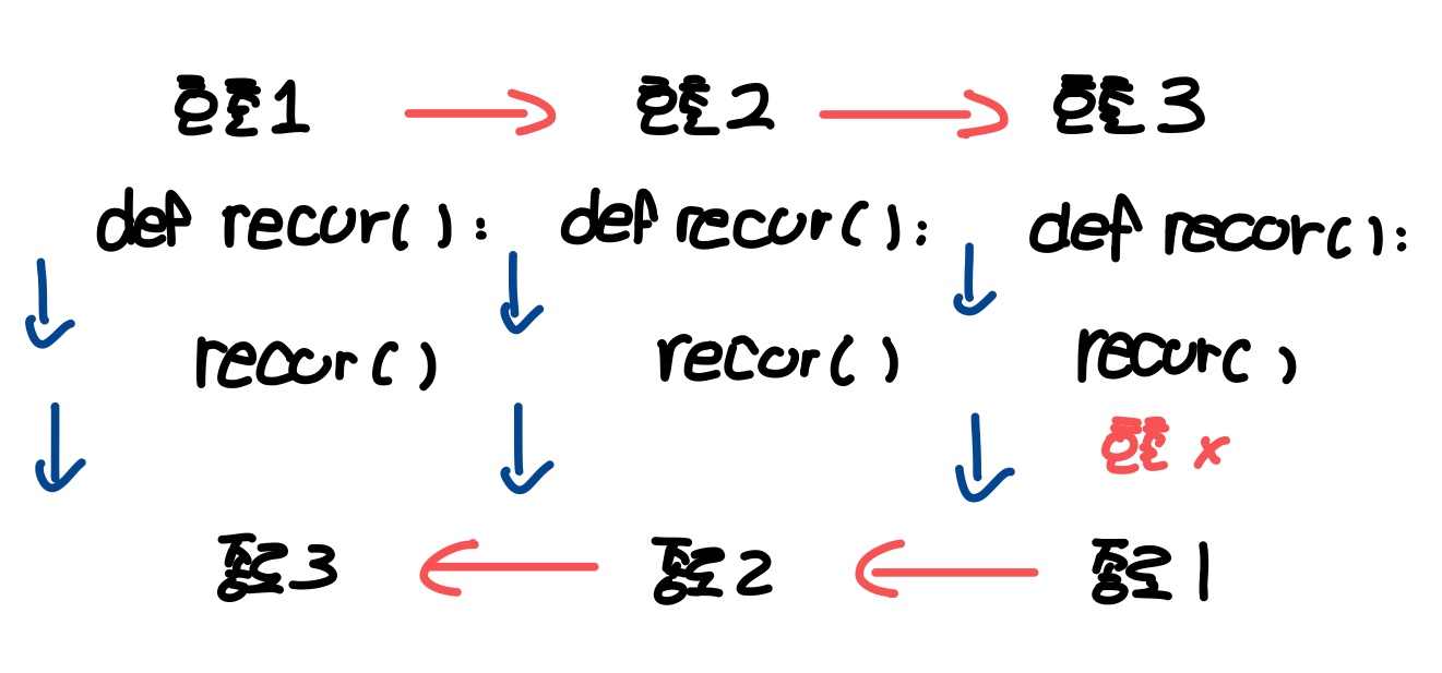 * 재귀함수 사용시에는 조건문을 활용하여 재귀함수 종료조건을 삽입해야 함