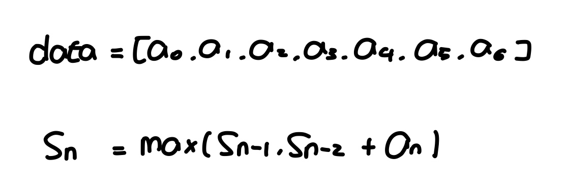 -> 합의 최댓값 = 바로 이전 값인 4와, 현재값인 5와 5와 이웃하지 않은 n = 0에서의 3과의 합 중 더 큰 값 ∴ 8