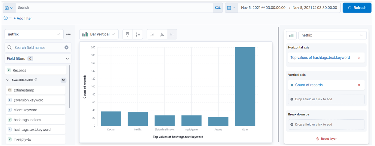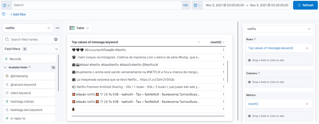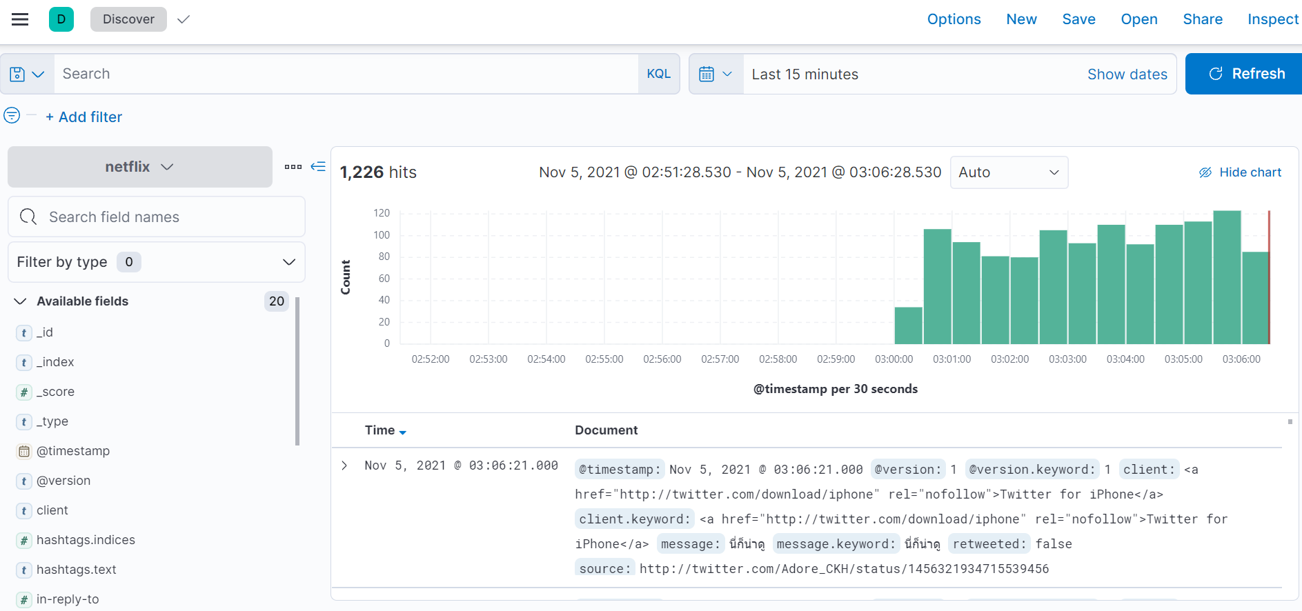 "netflix" Keyword에 대해 트윗에서 실시간으로 수집한다. (멈춰있는 것으로 보이지만, Kibana 대시보드에서 /cat/indices 쿼리를 날려보면 인덱스가 생성되었고, 제대로 수집되고 있는 것을 확인할 수 있다)