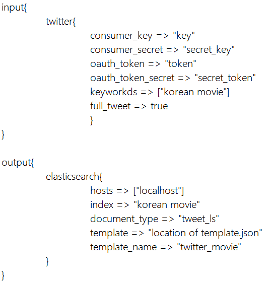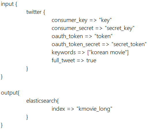 -> logstash에서 트윗 데이터를 실시간으로 수집하기 위해, 다음과 같이 logstash의 conf 파일을 수정해 주어야 한다.