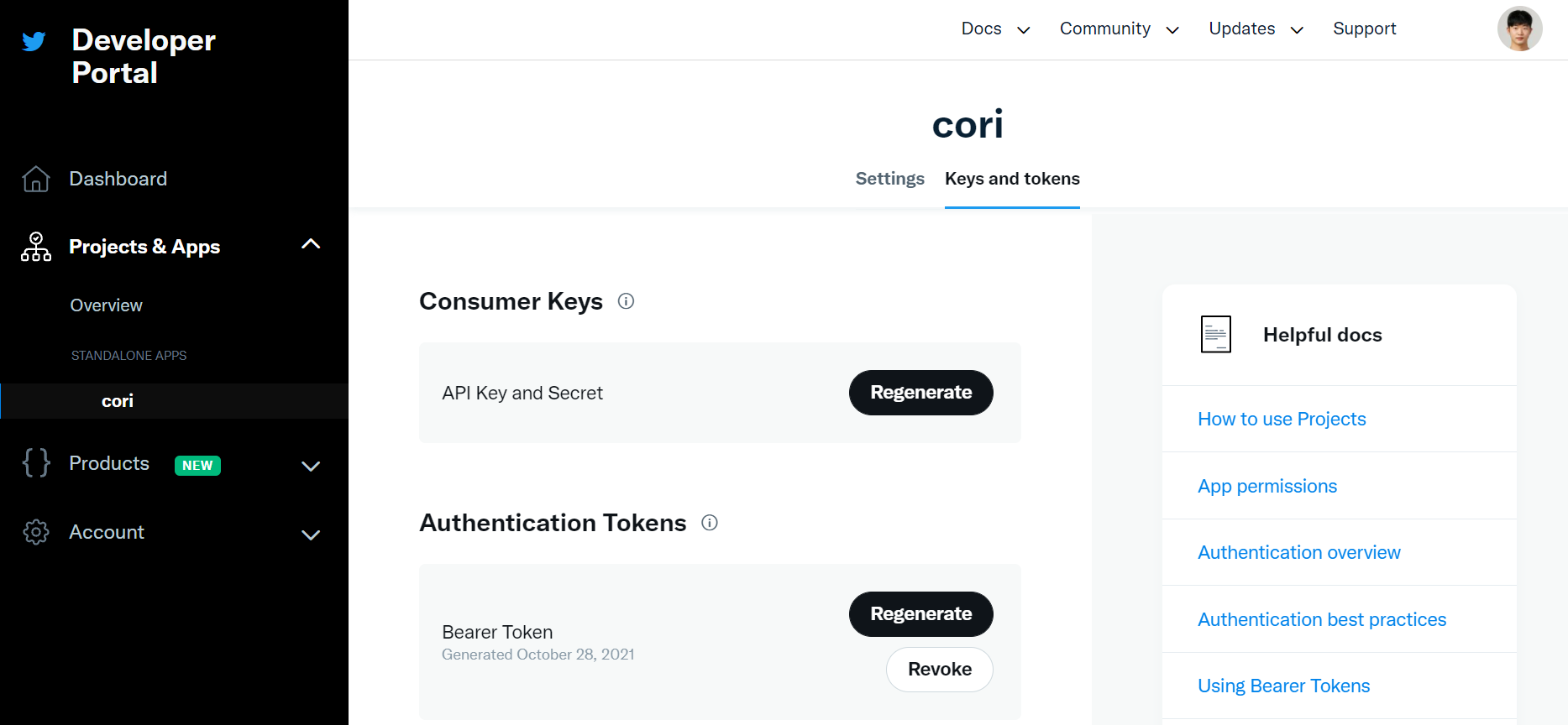 위 대시보드에서 API Key, API Key Secret, Access Token, Access Token Secret 총 4개의 인증 값을 발급받아야 한다.
