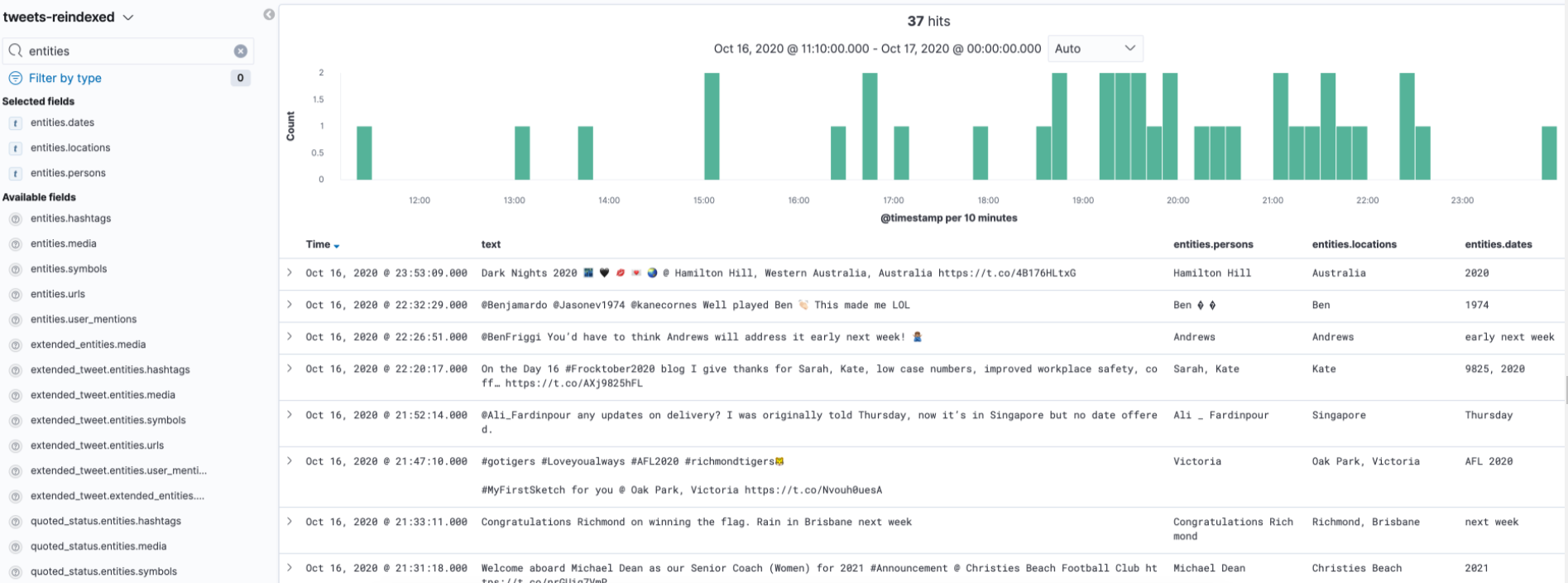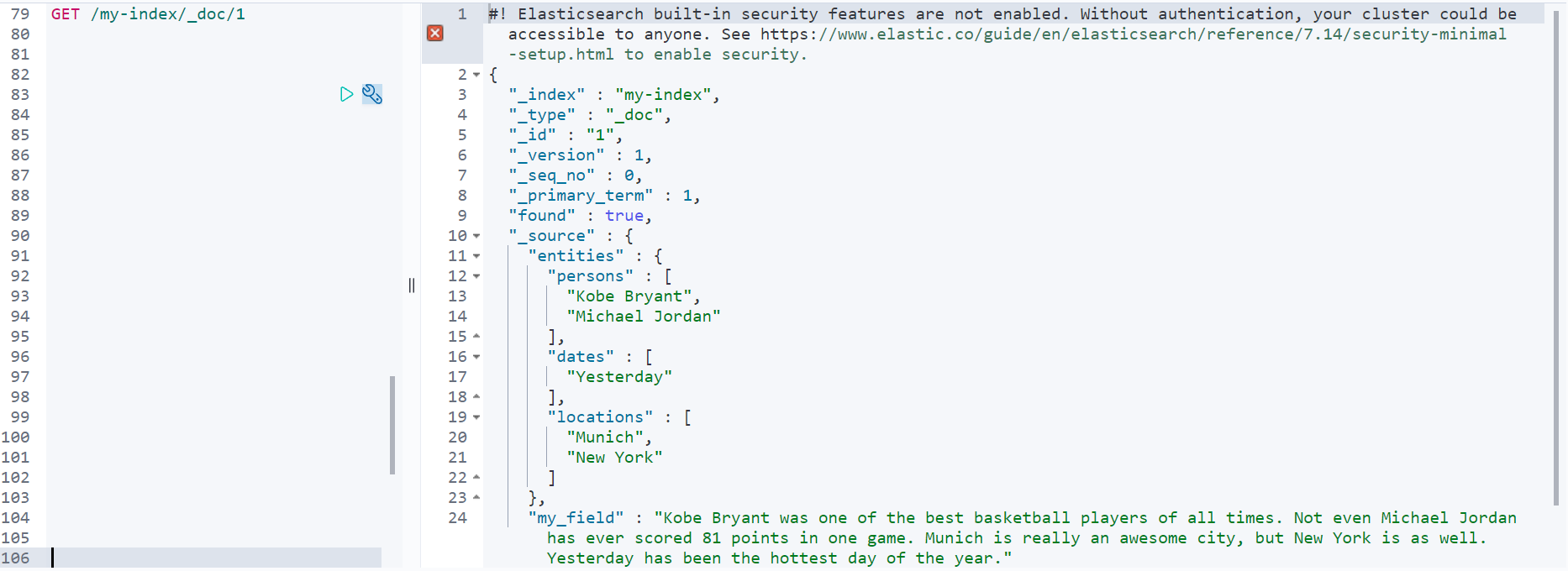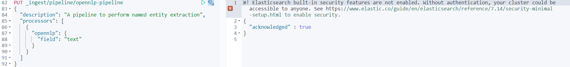 OpenNLP plugin을 이용한 기본적인 NER 모델은 사람, 날짜, 위치 객체를 기본적으로 가지고 있다. Kibana Dev Tool에서 다음 3단계를 수행하여, 이러한 정보를 사용할 수 있다.