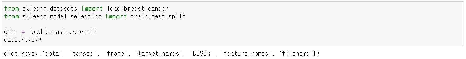 · scikit-learn에서 toy dataset으로 제공하며, load_breast_cancer() 함수로 로드 할 수 있다.