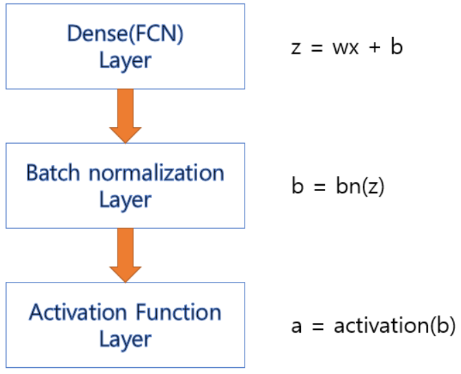 · Batch Normalization은 입력 데이터와 파라미터의 가중 합을 구한 결과에 적용한 뒤 그 결과를 Activation 함수에 전달한다.