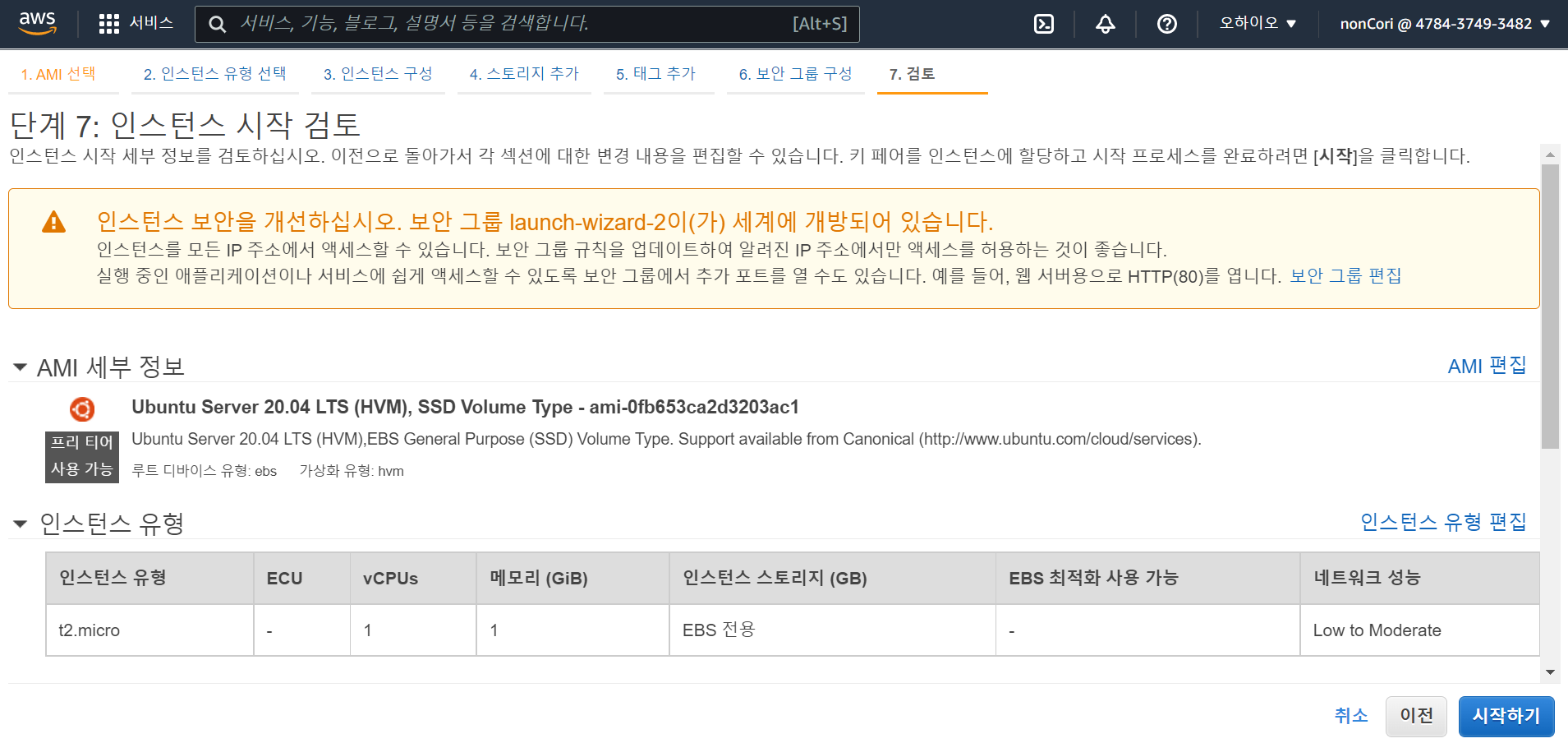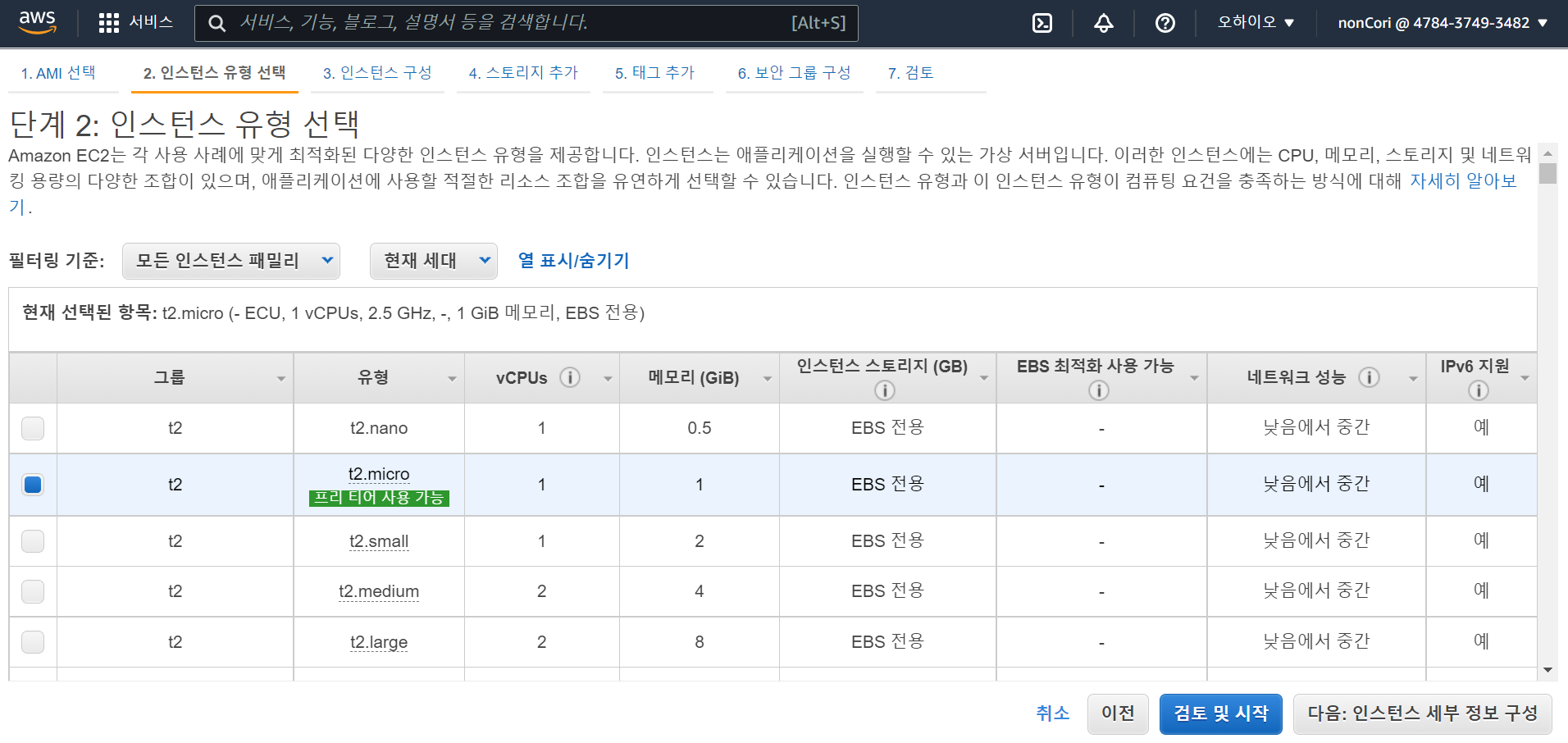 프리티어에서는 선택할 수 있는 인스턴스는 매우 한정적이어서, t2.micro 인스턴스를 사용한다. 검토 및 시작 클릭