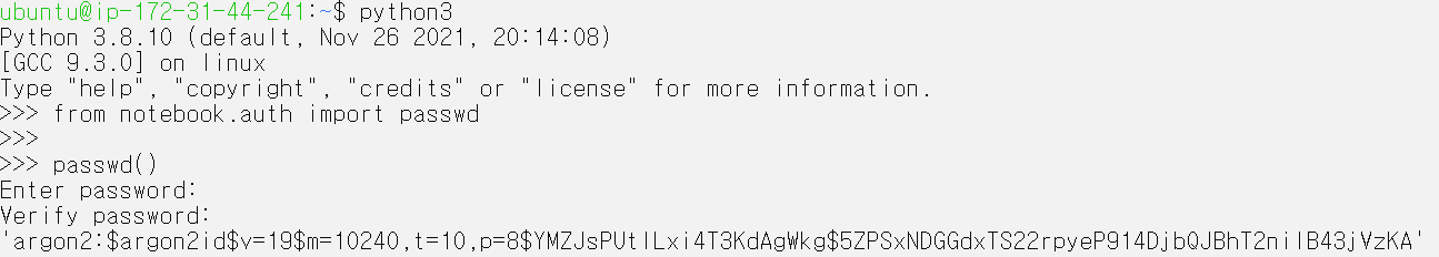 위에서 복사한 본인의 verify password, inet주소를 각각 c.NotebookApp.password, c.NotebookApp.ip에 넣어줍니다