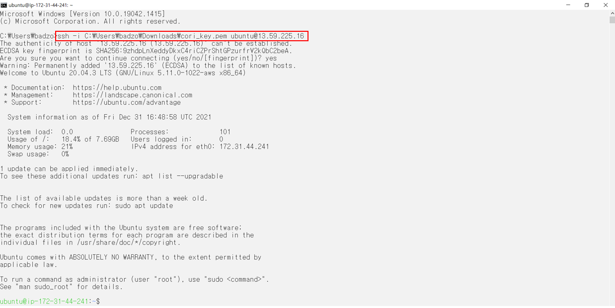 -> 명령 프롬프트를 실행시키고, ssh -i [키페어 주소] [사용자 이름]@[퍼블릭IP주소] 명령어를 통해 인스턴스에 접속