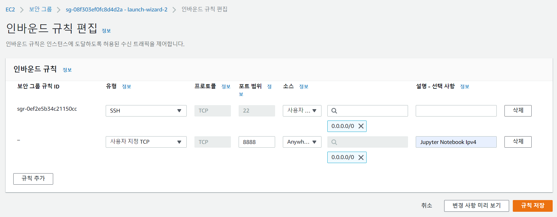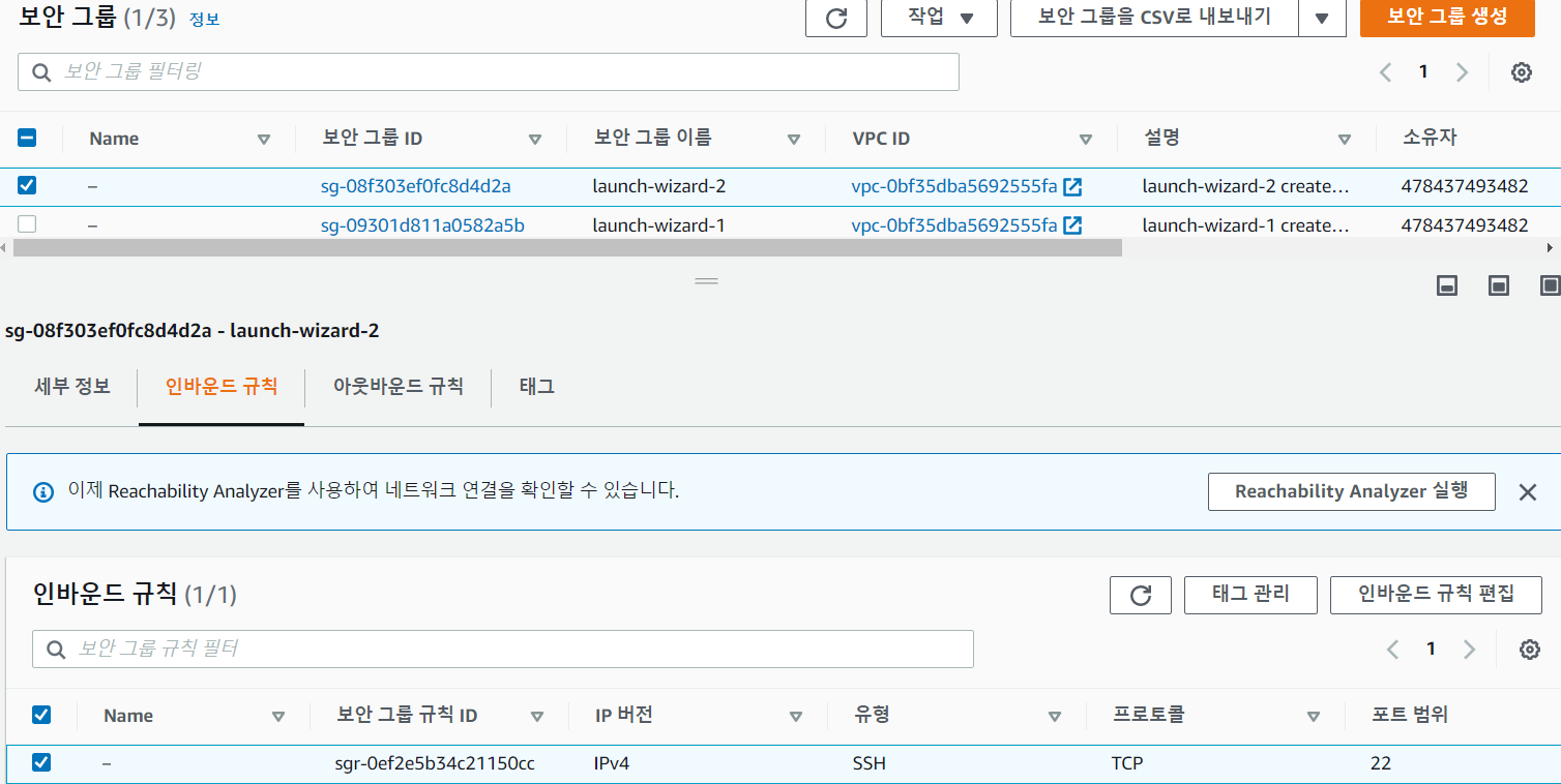 실행중인 인스턴스는 launch-wizard-2 보안 그룹을 사용중이에요. 인바운드 규칙을 편집해줍니다 .