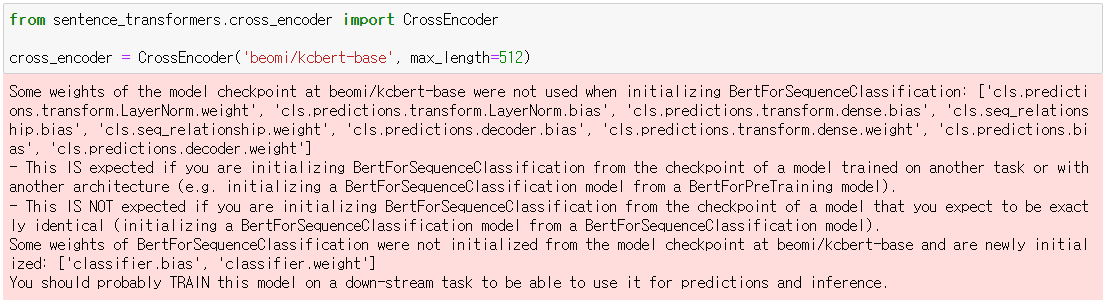 Cross-encoder는 Sentence Trasnforemr 라이브러리를 이용해 구현