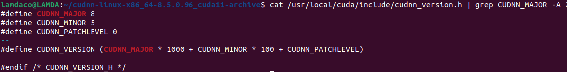 $ cat /usr/local/cuda/include/cudnn_version.h | grep CUDNN_MAJOR -A 2 # cudnn 8.x 이후