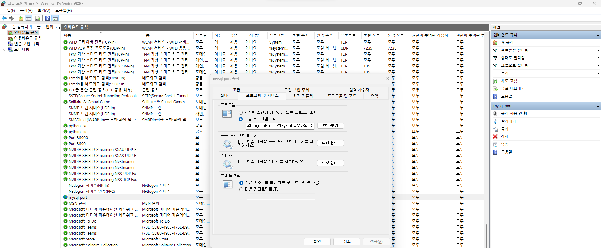 방화벽을 설정해주자. 제어판 -> 시스템 및 보안 -> Windows Defender 방화벽 -> 고급 설정에서 설정해주자.