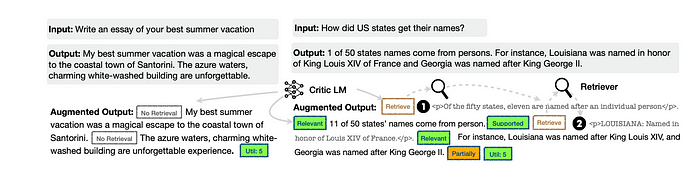 RAG와 비교했을 때, self-RAG 프레임워크의 차이점은 생성 과정에서 더 정밀한 제어를 위해 반영 토큰(reflection tokens)을 사용한다는 것으로, 이는 다음 그림에서 확인할 수 있다.