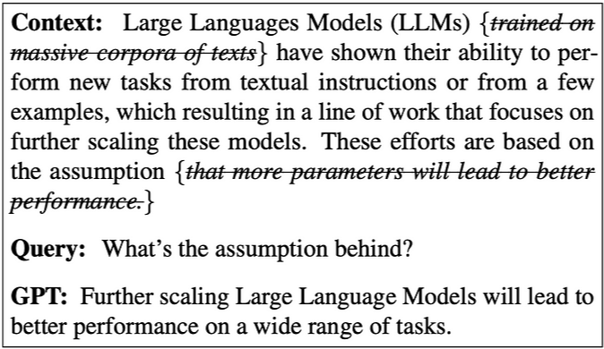 다음 그림은 LLM이 전체 컨텍스트나 완전한 대화 기록 없이도 사용자 쿼리에 응답할 수 있음을 보여준다. 관련 정보가 생략되더라도 LLM은 예상된 응답을 생성할 수 있으며, 이는 LLM이 문맥 단서와 사전 훈련 중 얻은 사전 지식을 통해 누락된 정보를 추론할 수 있을 것으로 생각된다.