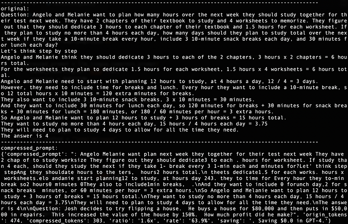 compressed_prompt = llm_lingua.compress_prompt(PROMPT, rate=0.33, force_tokens = ['\n', '?'])