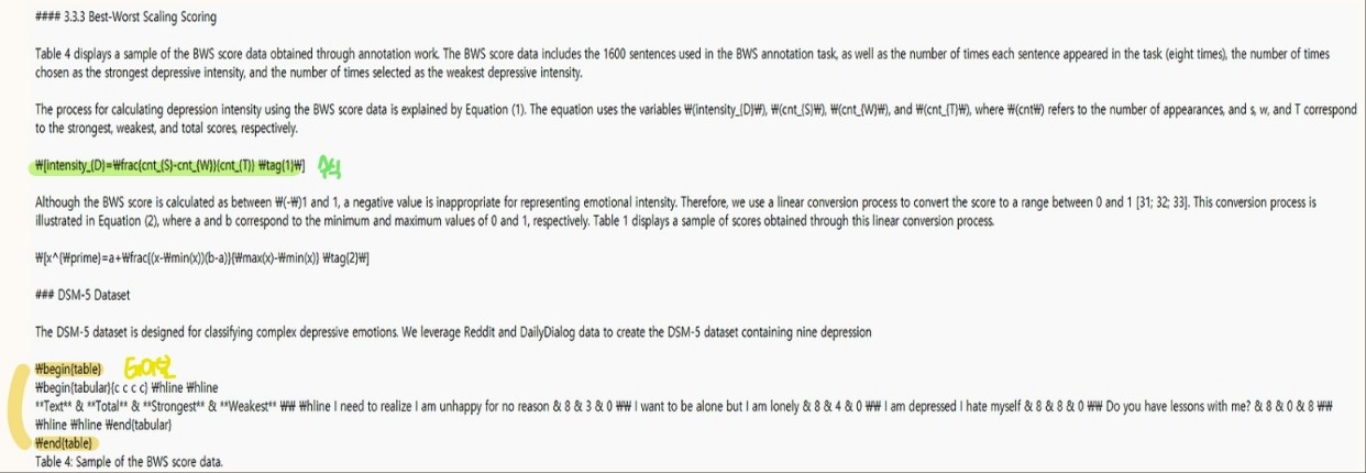 실행이 완료되면 우리는 mmd 파일을 얻을 수 있다. nougat을 통해 추출된 결과물을 살펴보면, 테이블은 \begin{table} ~ \end{table} 형태로 감싸져있고, 수식은 \[ ] 기호로 감싸져 있는 것을 확인할 수 있다.