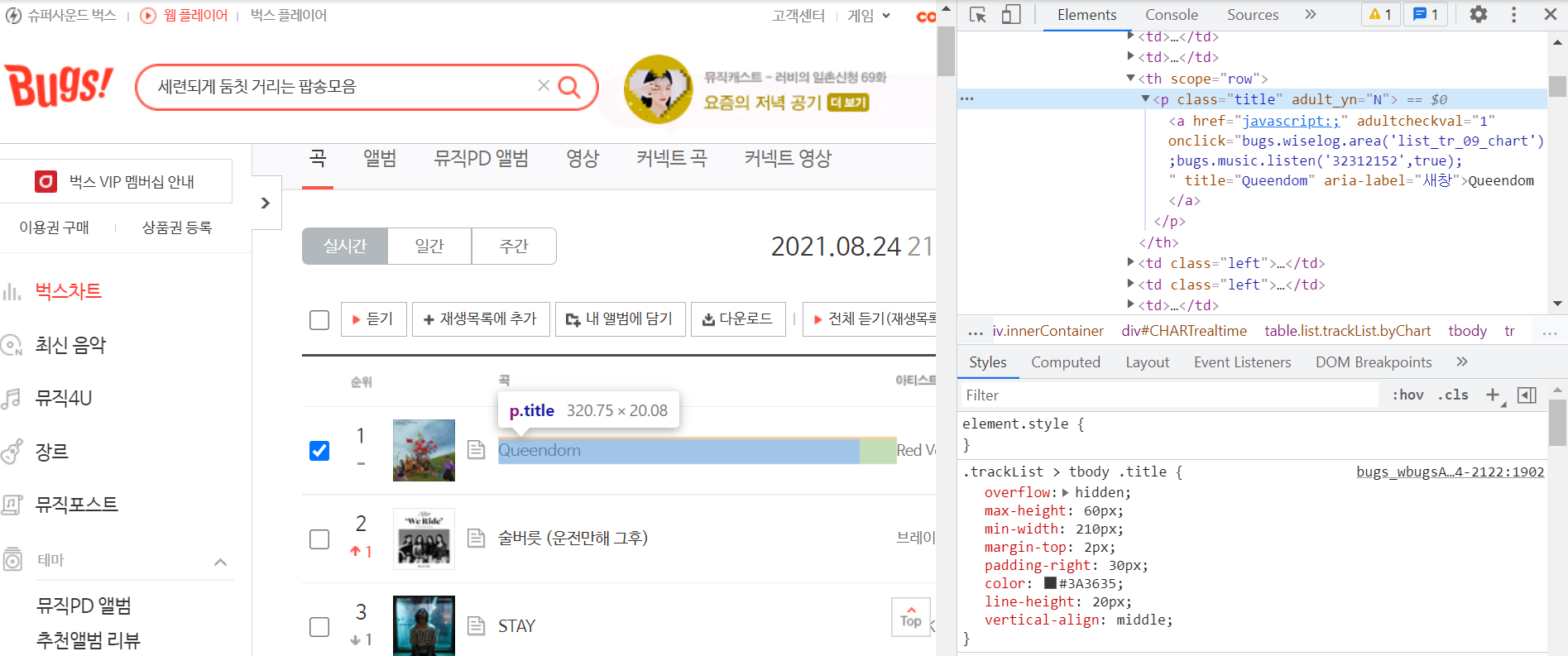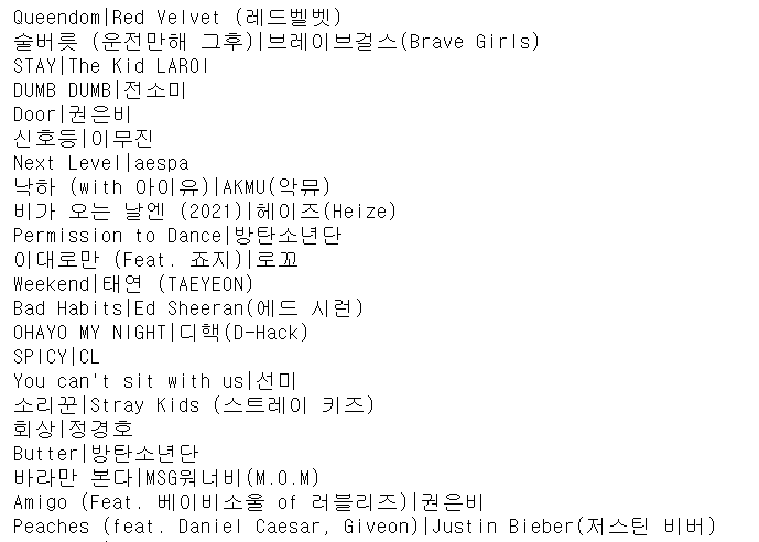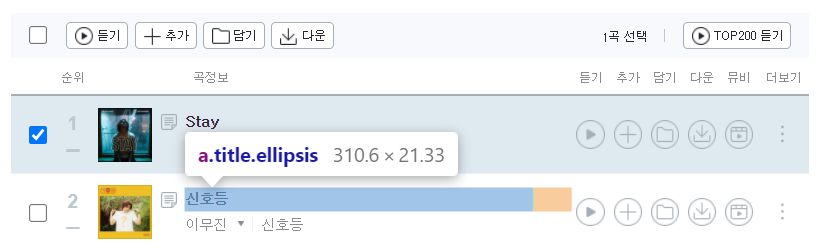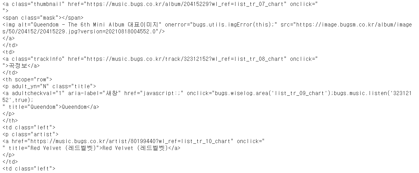 노래 정보를 포함하는 태그를 제대로 찾았기 때문에, 이 태그를 이용해 노래 제목과 가수명을 추출해보자.