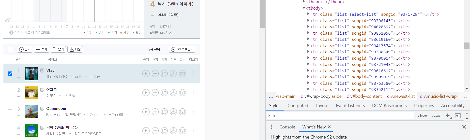 테이블의 클래스 이름을 지정하여 선택하였더니, 우리가 원하는 100개의 음원 정보를 선택할 수 있었다.