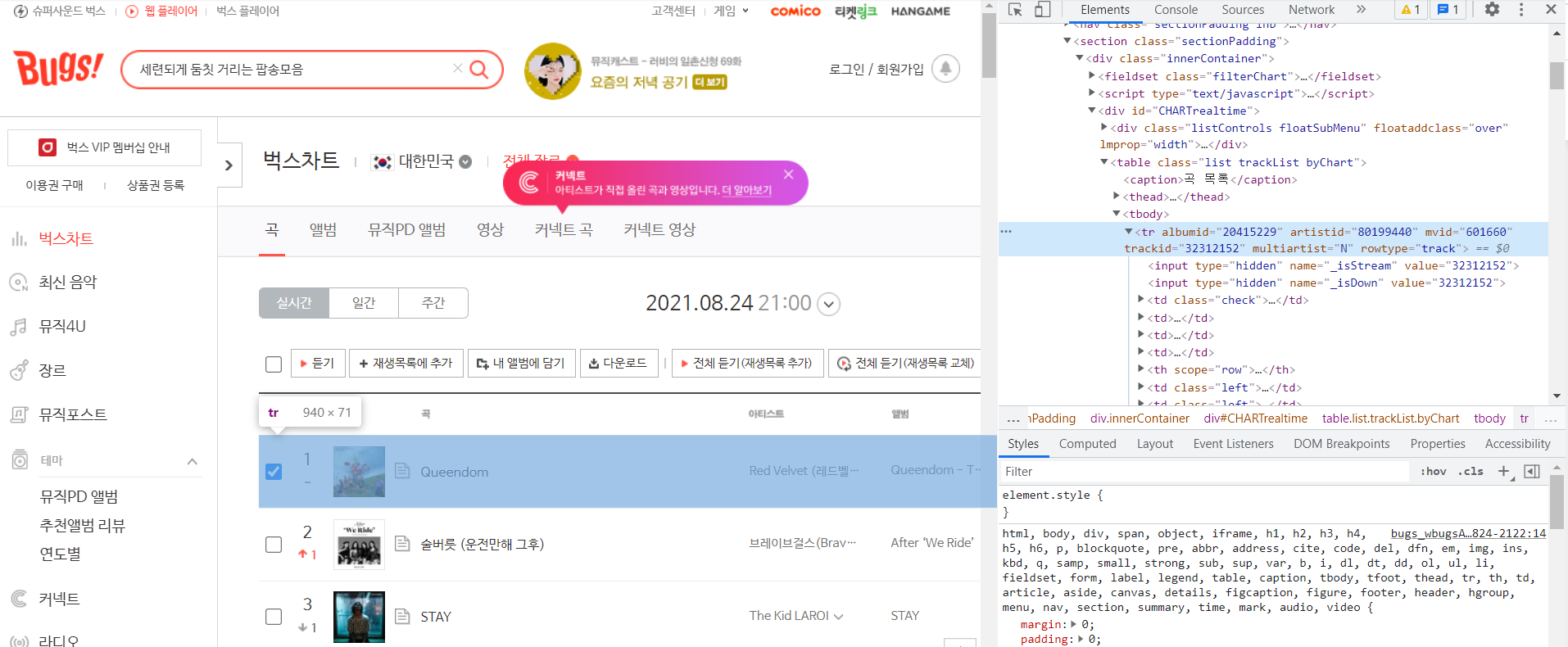 Bugs에는 tr 태그 안에 노래 제목, 가수 정보가 포함되어 있다. tr 태그를 살펴보자.