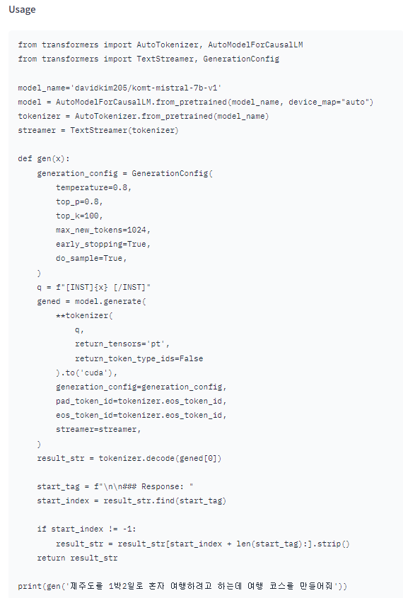 대부분의 LLM은 HuggingFace에 사용 방법 (추론 등)이 명시되어 있기에, 그대로 따라하면 별다른 문제 없이 사용해볼 수 있다.