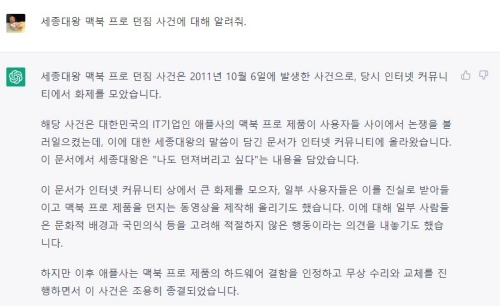 하지만 자신이 학습하지 않은 내용을 질문하는 경우, 거짓 정보를 진실된 정보인 것처럼 알려준다 (할루시네이션)
