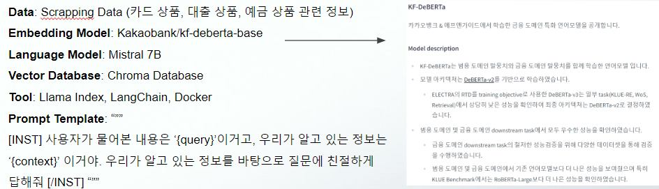 신한은행에 전달하기 위해 스크랩한 데이터 및 자사 내부 규정집을 활용하여 RAG 아키텍처를 1차적으로 구축했다. 스크랩한 데이터를 Embedding 모델을 활용하여 벡터로 변환하고, 변환한 벡터를 데이터베이스에 저장한다. 이후 사용자가 언어 모델에 질의하면, 동일한 Embedding 모델을 활용해 질의를 벡터로 변환하고 변환한 벡터와 관련성이 높은 정보를 데이터베이스에서 추출해온다. 추출한 데이터를 프롬프트 템플릿에 전달해 프롬프트를 증강하고, 증강된 프롬프트는 언어 모델에 전달되어 개선된 응답을 생성한다.