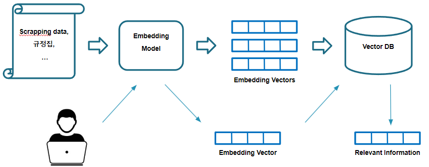 챗봇 개발에 적용중인 알고리즘은 RAG (Retrieval-Augmented Generation)이며, 해당 알고리즘을 순차적으로