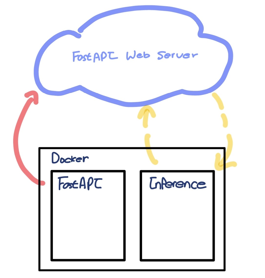 개발은 모두 도커 환경에서 진행한다. 처음에는 하나의 도커 컨테이너 내에서 FastAPI 웹 서버도 띄우고, 모델 학습 및 추론 등과 같은 작업을 수행하려 했다. 그런데 이러한 방식으로 진행할 경우 당장에는 무리가 없지만 점점 규모가 커지면 독립성 부재로 인한 문제가 발생할 수 있을 것 같았고, FastAPI 웹 서버용 컨테이너 하나, 모델 학습 및 추론용 컨테이너 하나로 개발을 진행하기로 했다. (도커를 분리해서 진행하다보니, 하나로 퉁쳐서 진행할 때에는 없었던 문제 - 네트워크 연결 등 - 들이 여럿 발생하였고 이 과정 또한 여기서 다뤄보고자 한다)