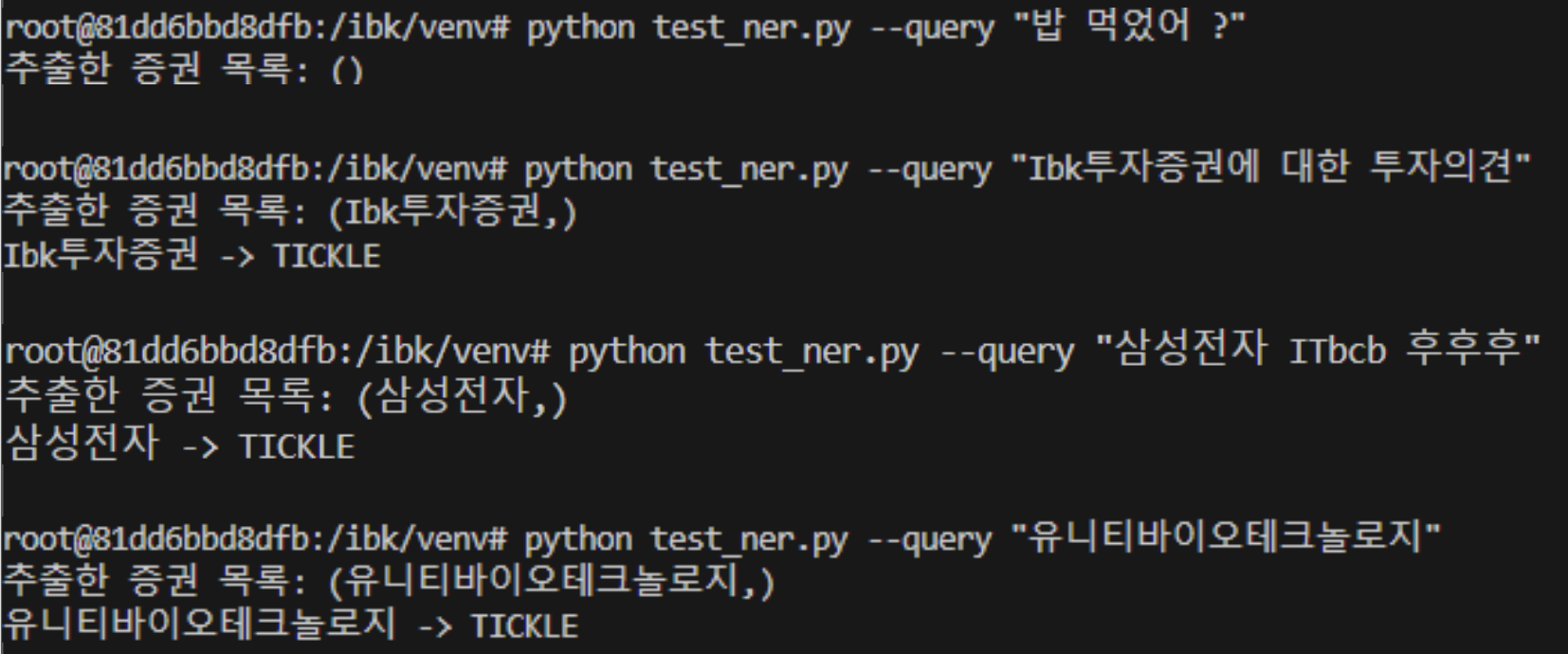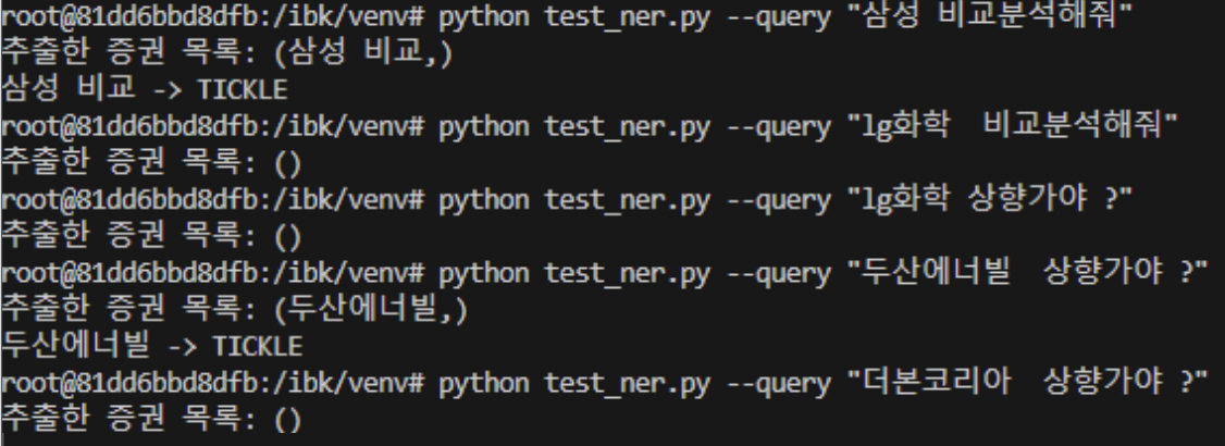 일상 대화에서 종목 정보를 추출하는 오류도, 접미사를 같이 추출하는 오류도 이전 모델보다 훨씬 개선되었다.
