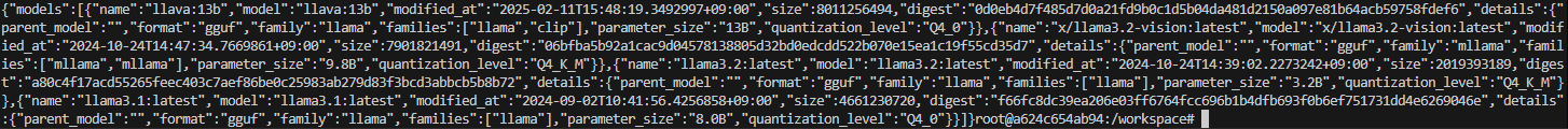 컨테이너 내부로 들어갔다면, 외부에서 실행되고 있는 Ollama와 연결이 가능한지 테스트해보자. 여기서 주의할 점은, 도커 내에서의 localhost는 컨테이너 내부를 가리키기 때문에, curl http://localhost:11434/~ 와 같은 방식으로 연결을 시도하면 잘 동작하지 않는다는 점이다 !!