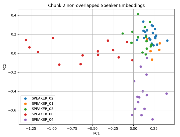 해당 파일을 들어보니, SPEAKER_00으로 등장한 화자는 SPEAKER_01과 SPEAKER_02가 동시에 말하는 구간에서, SPEAKER_02가 말할 때 기록된 화자로, 두 화자 간 임베딩 값이 혼합(Hybrid)되어 새로운 화자가 탄생하게 된 문제다. 근처 화자로 배정하려 해도, 위 그림에서 SPEAKER_00은 SPEAKER_01과 SPEAKER_02의 경계에 있어 특정 화자에 배정하기 어려운 상황이다.