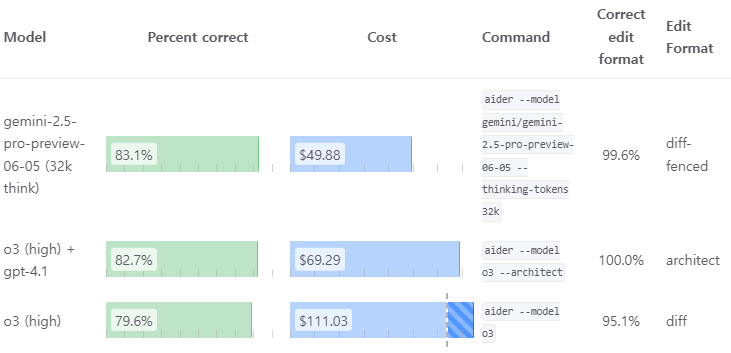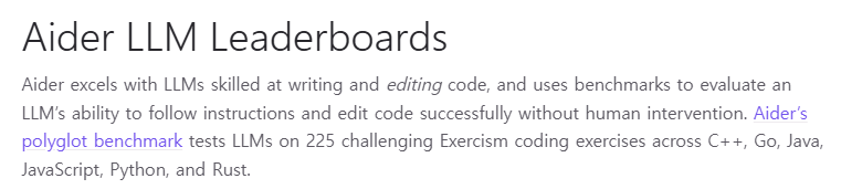 - aider.chat에서 사용하는 코딩 어시스턴트 모델들의 벤치마크