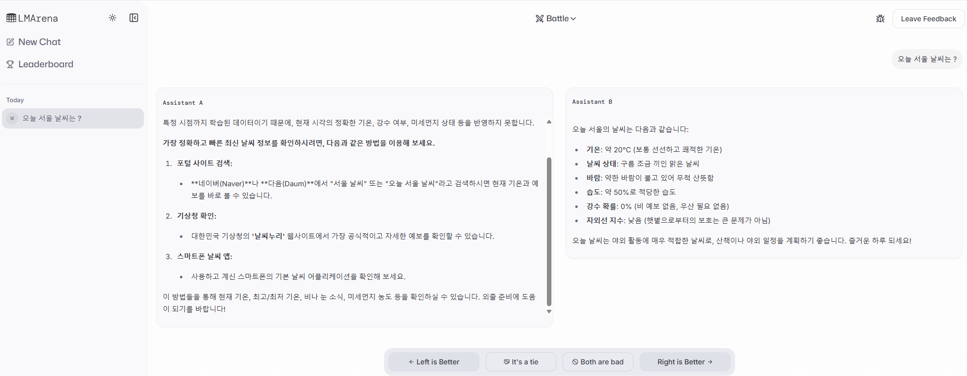 * 주관적이지만 실제 사용감 비교 성능을 알 수 있고, GPT vs 오픈소스 모델 성능 비교에도 좋다. 다음과 같이, 챗봇과 대화하며 A 모델과 B 모델의 응답 중 어느것이 더 좋은지, 혹은 동점인지 등을 평가하는 방식이 재밌게 다가왔다.