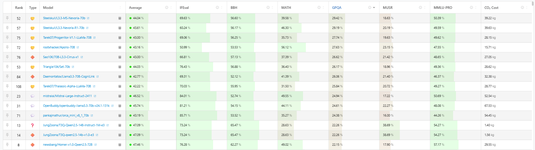 - 다양한 평가지표 (IFEval, BBH, MATH, GPQA, MUSR 등) 사용