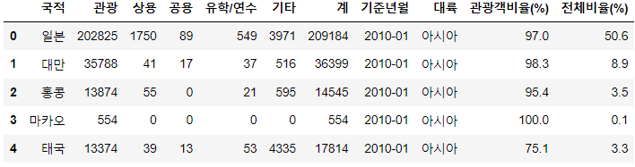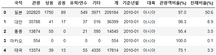 df_country['관광객비율(%)'] = round(df_country.관광 / df_country.계 * 100, 1)