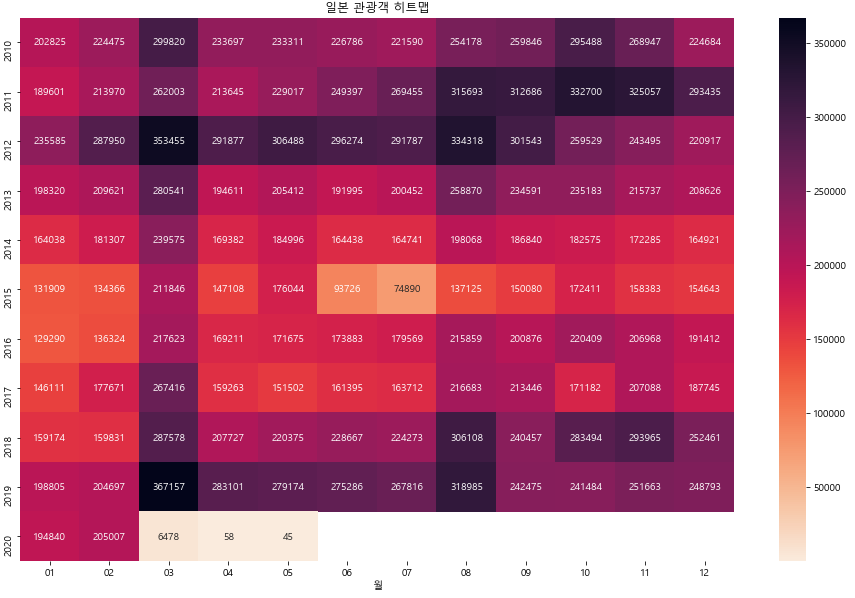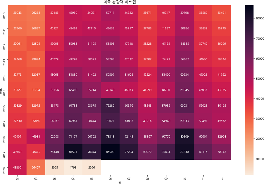 히트맵 그래프를 통해 어느 시기에 관광객이 많은지, 적은지 한 눈에 알아볼 수 있다. 앞선 그래프 작업과 마찬가지로, 반복문을 통해 여러 국적의 히트맵을 그려보자.