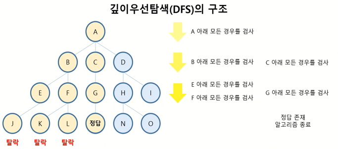 -> Depth First Search의 약자로, 하나의 경우의 수에 대해 모든 경우의 수를 조사하고 다음 경우의 수를 조사하며 해를 찾는 과정