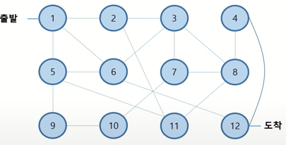 1번 섬에서부터 12번 섬까지 가는 최단 경로는 얼마인가 ? (단, 모든 경로의 거리는 1)