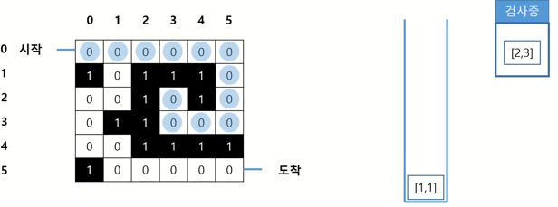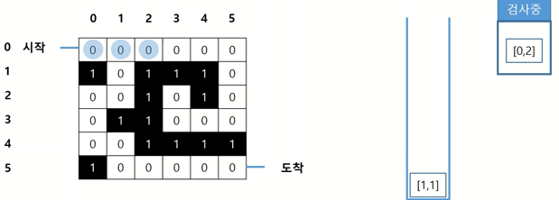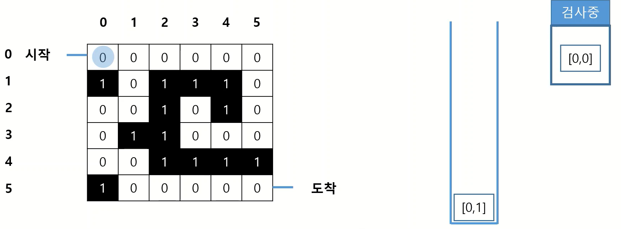 · 처음 시작점인 (0,0) 검사 -> 도착 지점이 아니기 때문에, (0,0)에서 갈 수 있는 모든 경우의 수를 스택에 추가