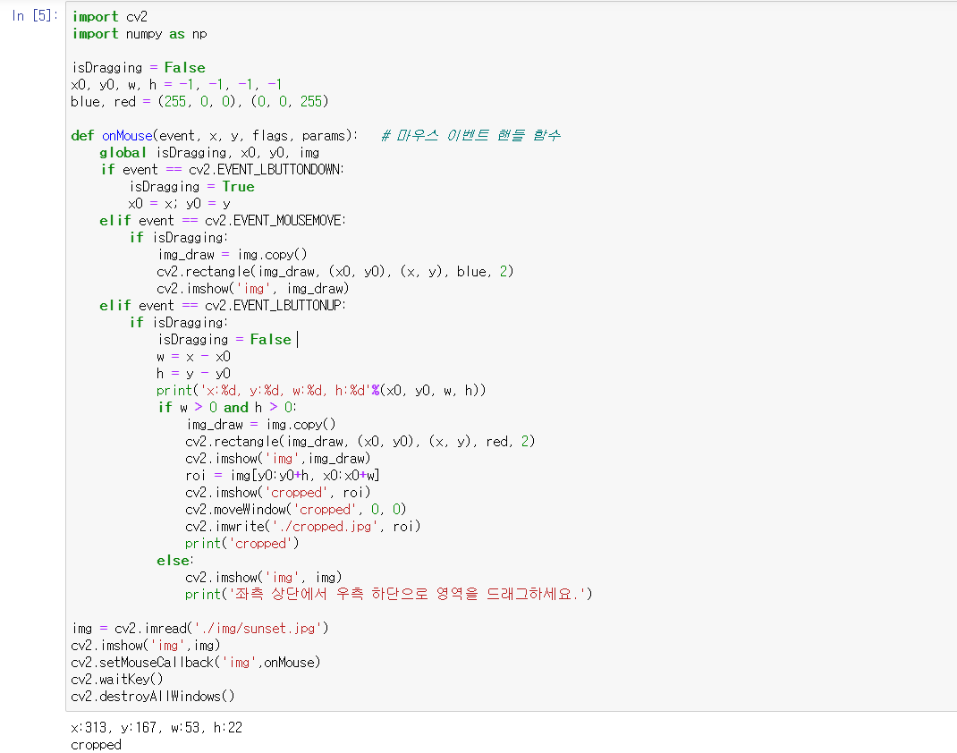* img_draw = img_copy() -> 마우스가 움직일 때마다 사각형을 그리게 되는데, 매번 같은 이미지에 사각형을 그리면 사각형이 누적된 채 그러져서 보기 좋지 않기 때문에 원본 이미지를 복사해 주어야 한다.