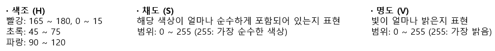 -> RGB와 마찬가지로 3채널 컬러 이미지 (H: 색조, S: 채도, V: 명도)를 표시. 명도를 표현하는 방법에 따라 마지막 V를 I(Intensity, 밀도), L(Lightness, 명도)로 표기하는 컬러 시스템 존재
