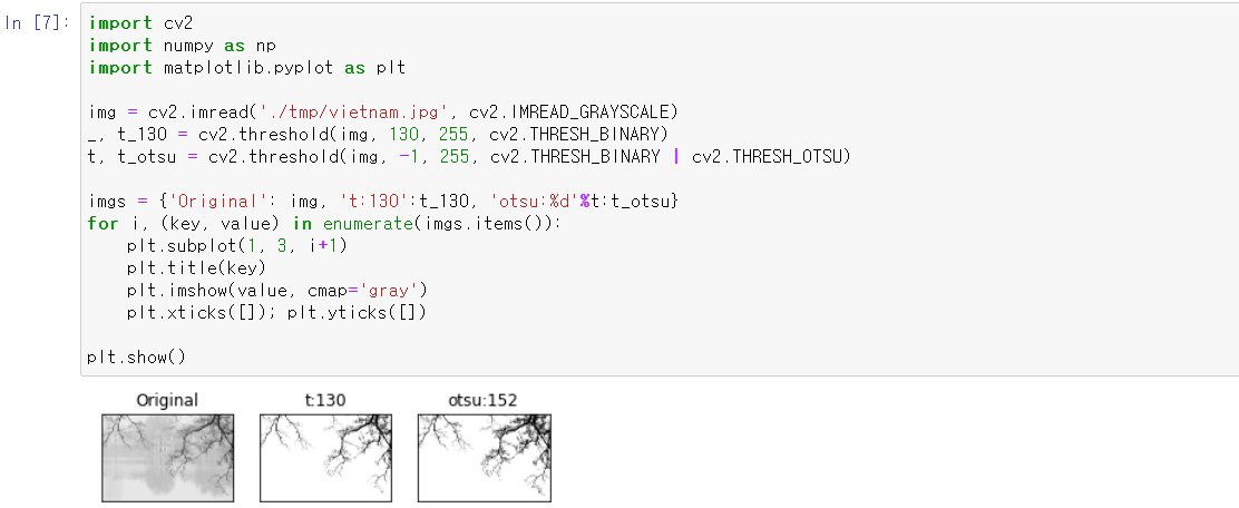 -> cv2.threshold() 함수의 마지막 인자에 cv2.THRESH_OTSU를 추가해서 전달한다. (원래 경계 값을 전달하는 두번째 인자는 무시됨)