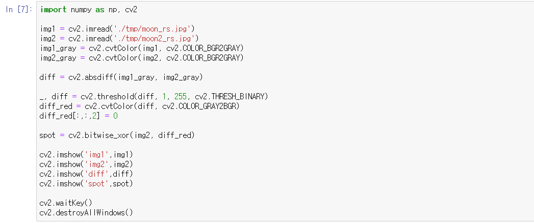 두 영상 간 다른 점 찾기 (차영상)