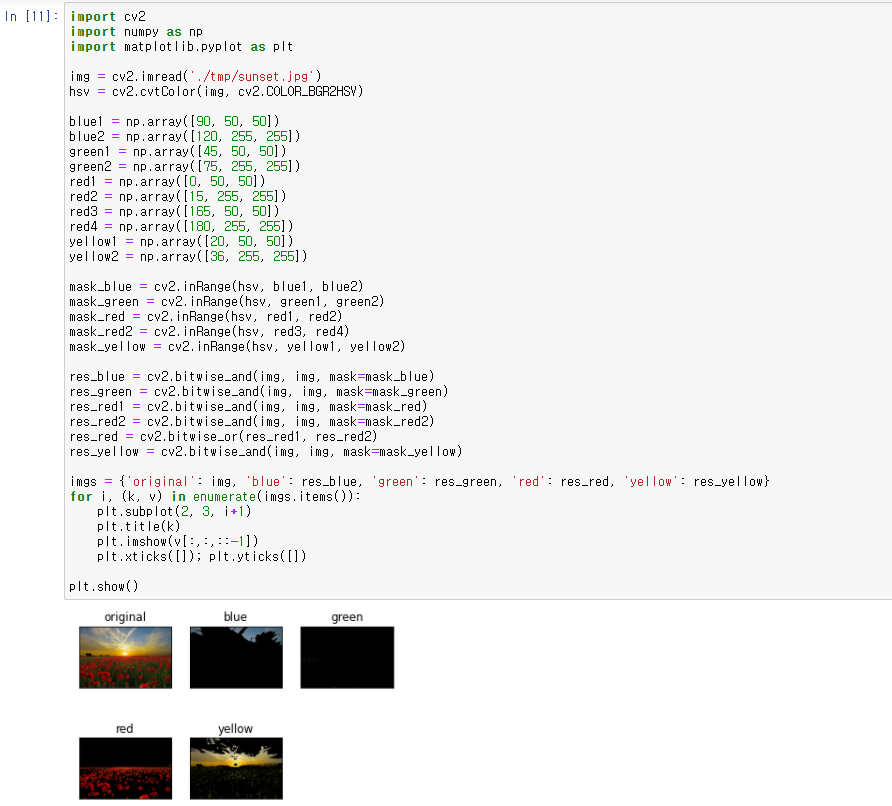 -> 색상에 따라 영역을 떼어내야 하는 경우, 색을 가지고 마스크를 만들어아 함 .. HSV로 변환하여 원하는 색상 범위의 것만 고르기