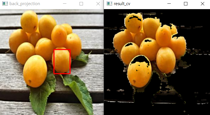 역투영 결과 값은 추적 대상 객체의 색상 값과 비슷한 영역의 픽셀들만 큰 값을 가짐