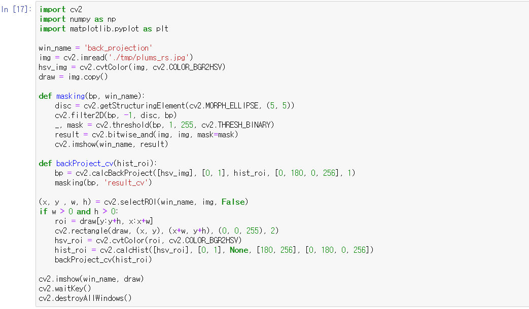 기본 원리는 물체가 있는 관심영역과 H와 V 값의 분포를 얻어낸 후 전체 영상에서 해당 분포의 픽셀만 찾아내는 것